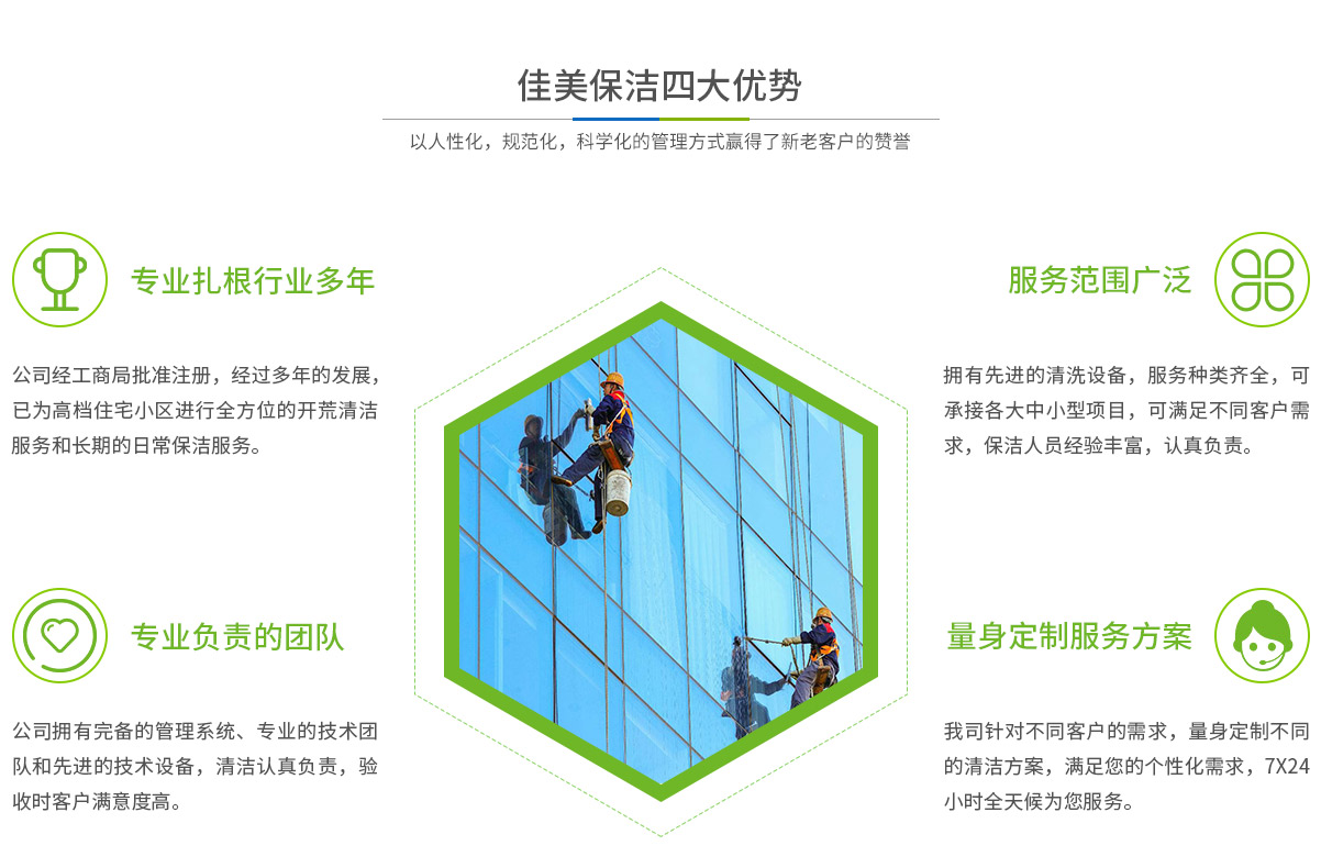 馬鞍山市佳美保潔服務(wù)有限公司是一家經(jīng)工商部門批準(zhǔn),具有法人資格專業(yè)清洗,馬鞍山保潔服務(wù)的公司,自創(chuàng)辦以來,一直致力于企業(yè),家庭,賓館,學(xué)校,別墅,酒店,商廈,公共設(shè)施等場(chǎng)所提供科學(xué)的日常保潔和清潔保護(hù)的服務(wù)公司,有著豐富的管理服務(wù)和保潔經(jīng)驗(yàn)...